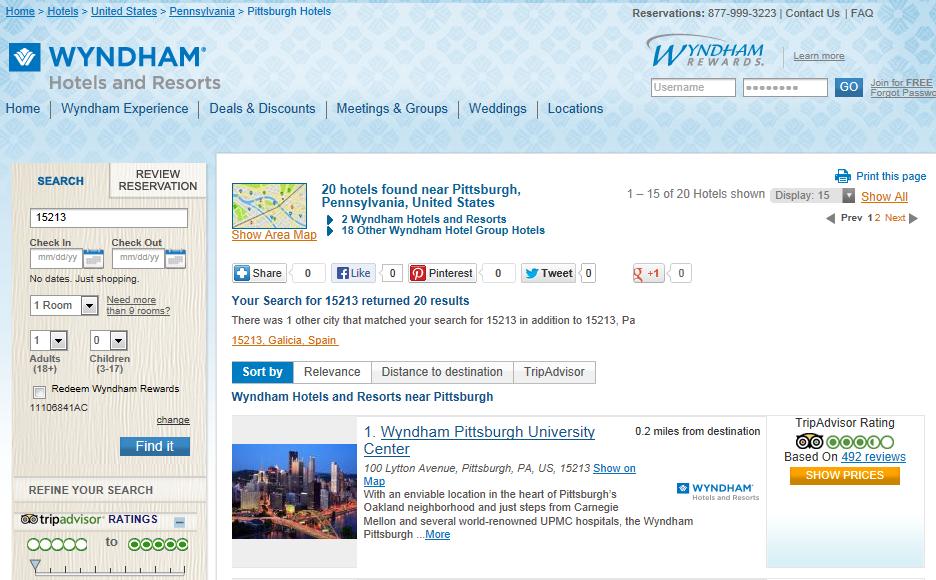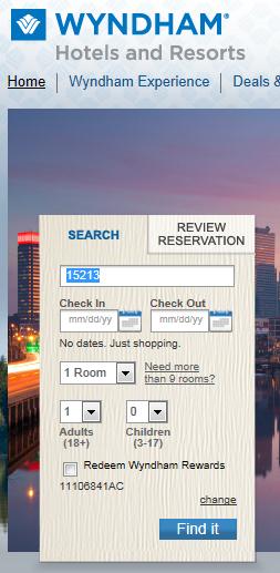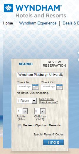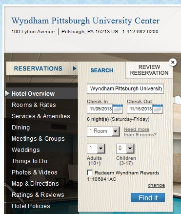After you click on the "Wyndham Pittsburgh University Center" link (it should be the first result shown), the page for that hotel will come up. Then click on the "Reservations" link. You should see something similar to: