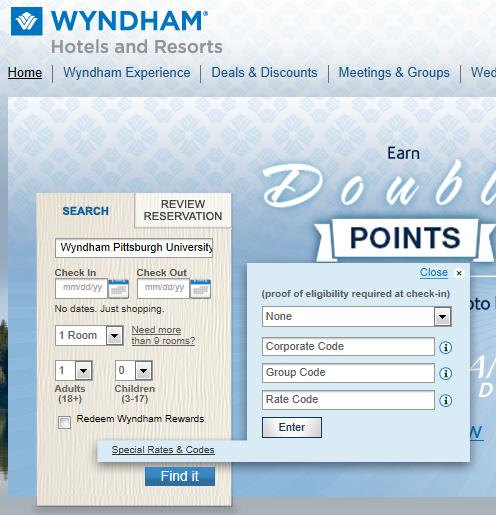 . Enter "Wyndham Pittsburgh University Center" in the box under Search. As you type it in (slowly), you'll see a drop-down list of matches. Before you enter the entire string, you can select "Wyndham Pittsburgh University Center, PA, US". There is a small blue link for "Special Rates and Codes" (as shown near the bottom of this picture). Click on it.