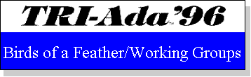 Conference attendees interested in forming Birds of a Feather get together with colleagues or who would like to organize Working Group meetings with those who share an interest, should contact the TRI-Ada '96 conference manager R. E. Abraham and Associates at 919-419-8242; E-mail:74117.35@compuserv.com